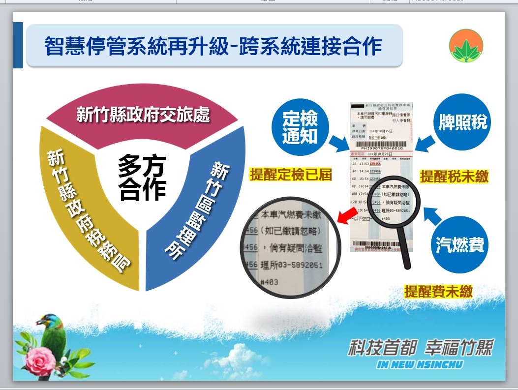新竹縣政府交通旅遊處與交通部公路局、新竹區監理所、新竹縣政府稅務局合作,將自114年11月1日起開始,在紙本停車單上整合「車輛定檢尚未驗車、牌照稅屆期未繳交提醒通知、車輛汽燃費未繳交通知」等資訊,一紙提醒民眾不錯過繳費及驗車時間,以免衍生後續罰鍰等問題。
