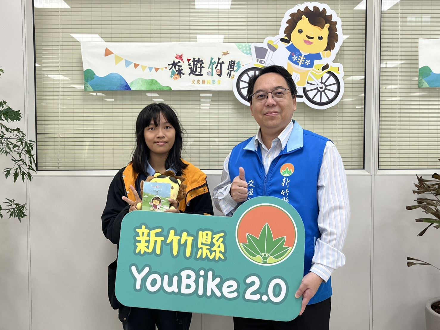 新竹縣公共自行車(YouBike)使用量再突破!新竹縣政府宣布新竹縣公共自行車累計騎乘量截至11 月 11 日突破 500 萬人次,寫下營運以來重要里程碑,展現縣民對低碳運具高度支持。由新竹縣公共自行車營運團隊(微笑單車)舉辦「尋找竹縣第 500 萬人次幸運兒」活動,包含前、後各2位使用者(第4,999,998至第5,000,002人),其中2位幸運得主在11月21日於交通旅遊處現身領獎,這次除原有活動提供精美好禮外,交旅處長陳盈州也加碼竹縣最新款觀光大使「皮皮獅」玩偶及「皮皮獅悠遊卡」各1 組,讓現場民眾驚喜連連又溫馨。
